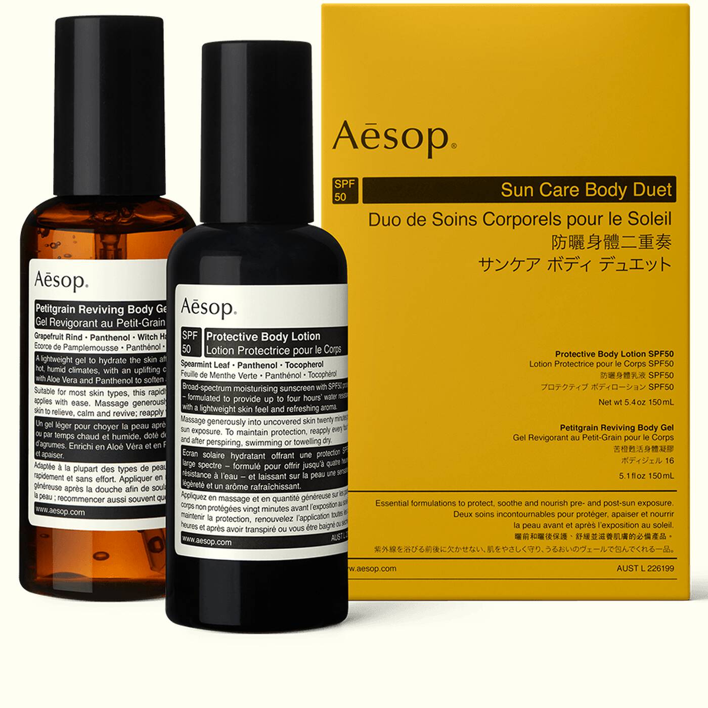 This warm-weather pairing includes Protective Body Lotion SPF50 and Petitgrain Reviving Body Gel to protect, soothe and revive pre-& post-sun exposure.