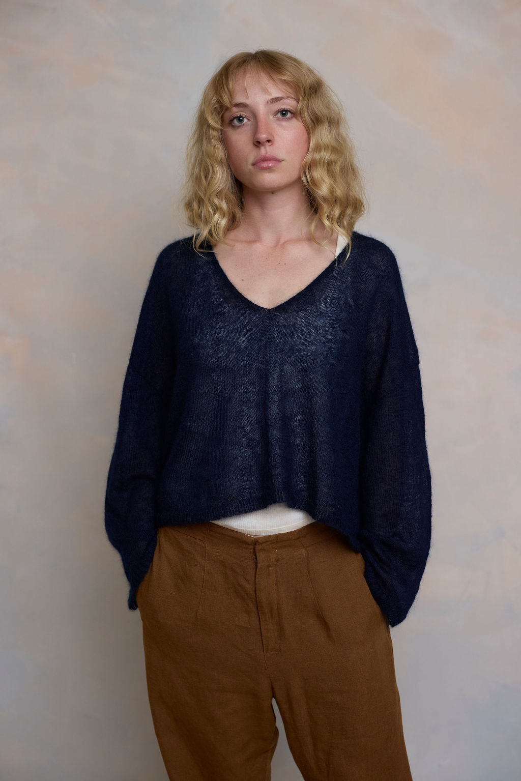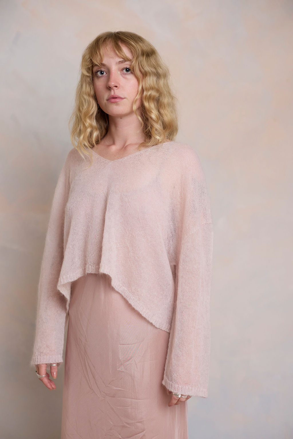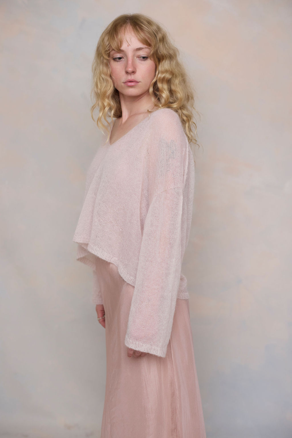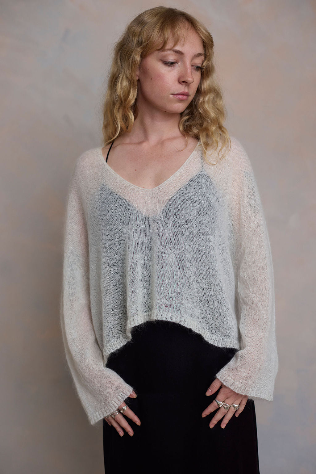 Gossamer soft & sheer kid mohair Crop V Neck Sweater.