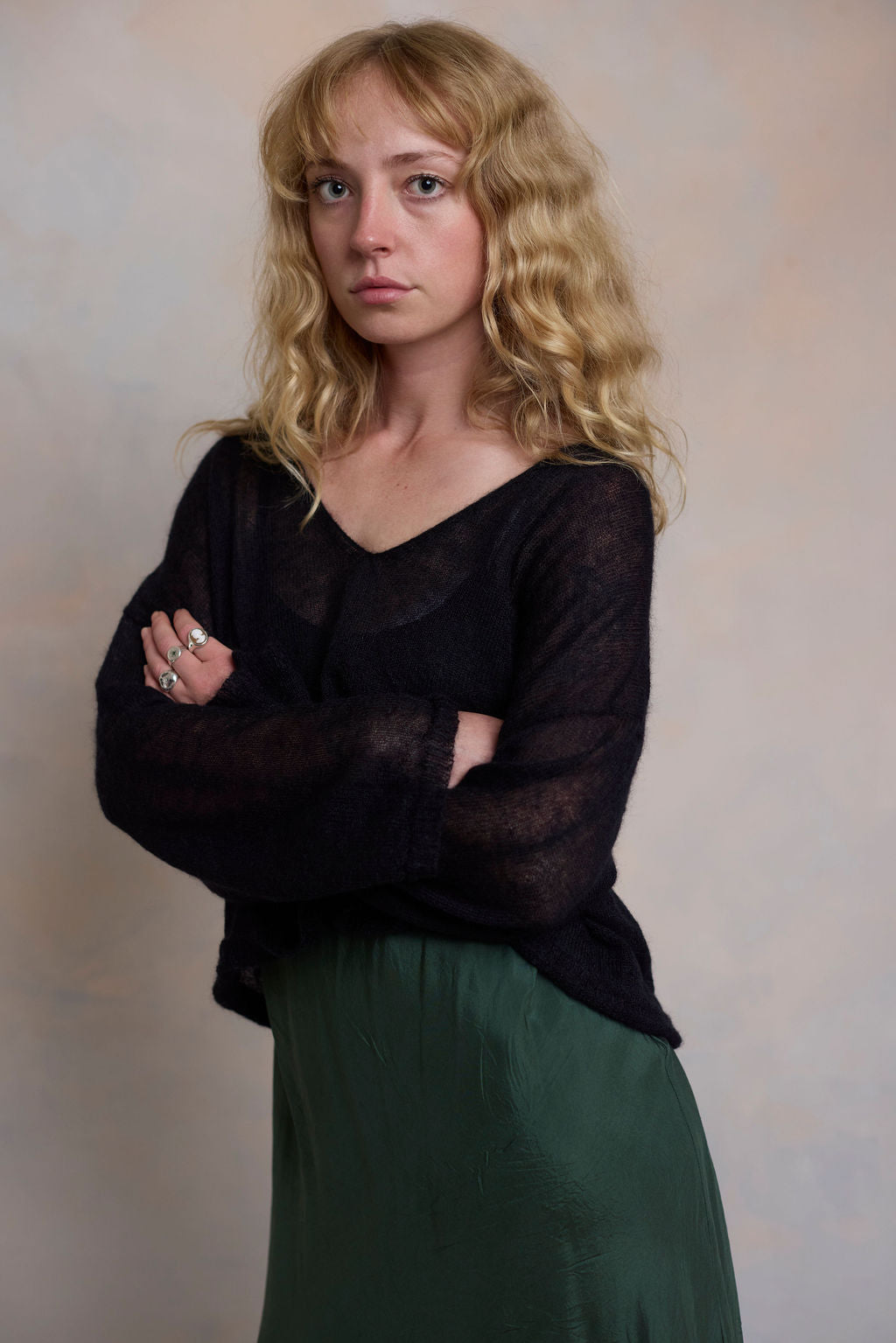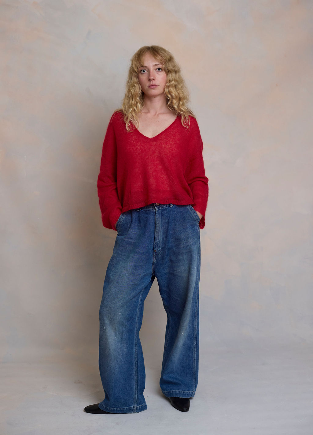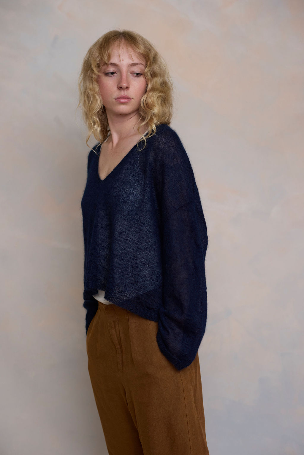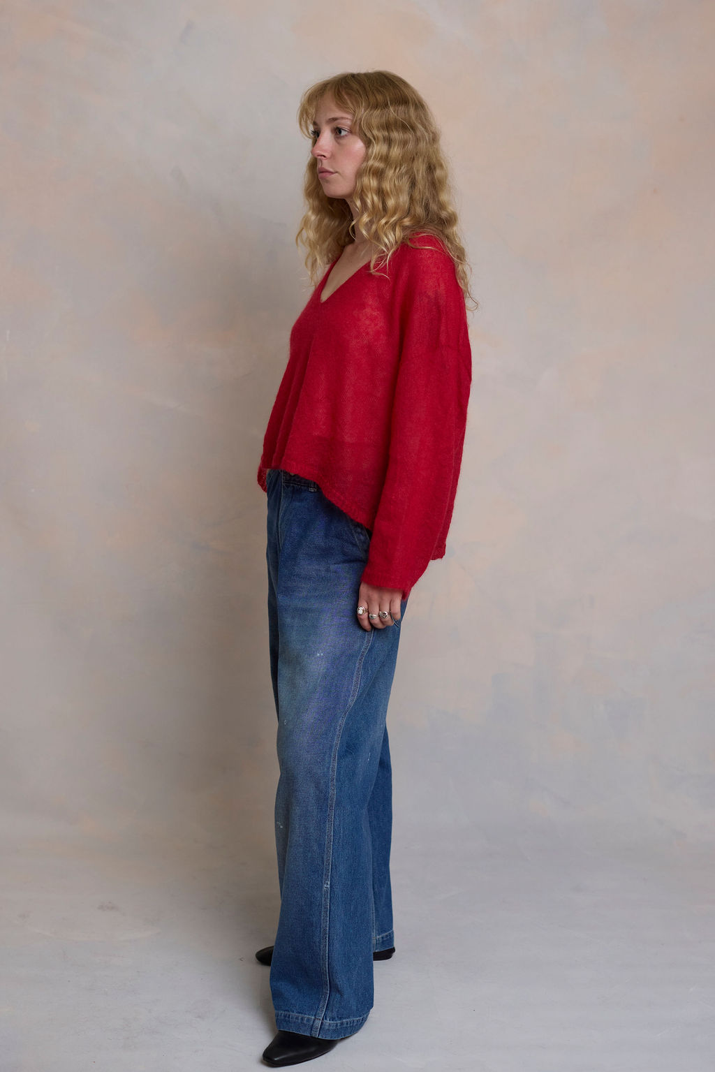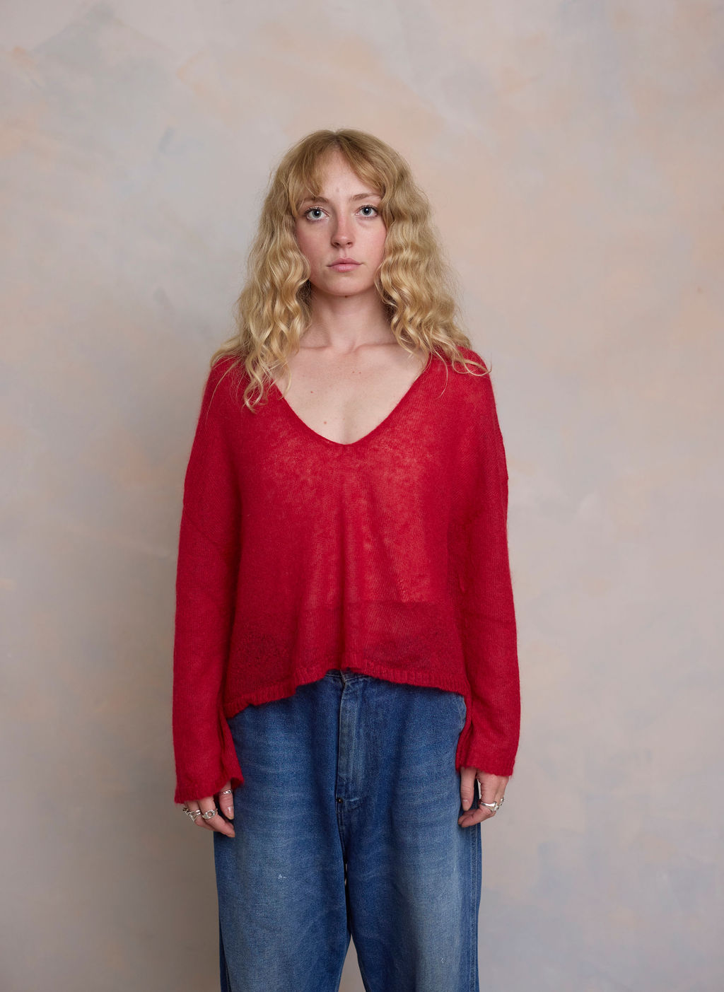 Gossamer soft & sheer kid mohair Crop V Neck Sweater.